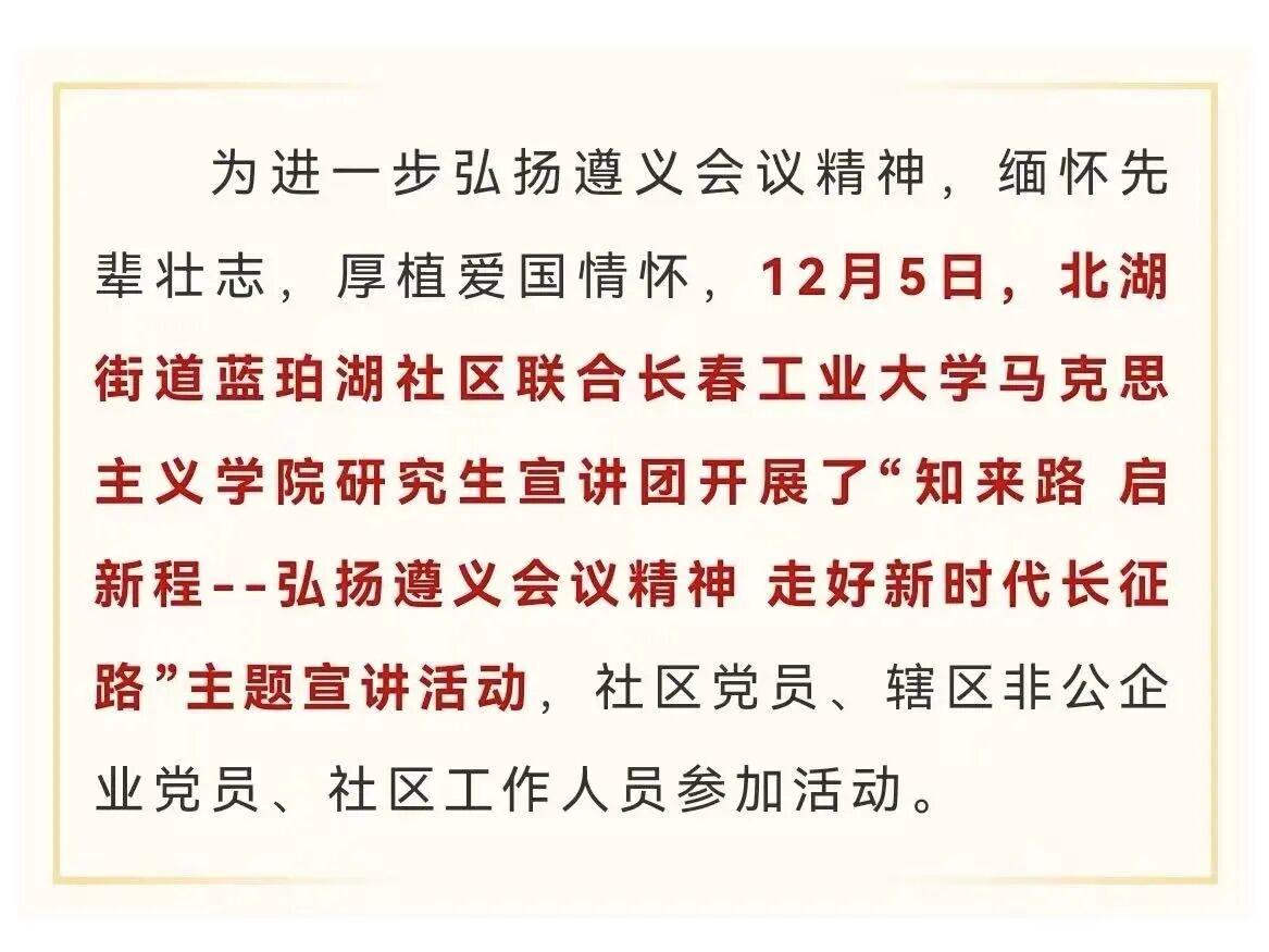 宣讲团自成立以来,已面向社区和大学生群体开展了5场宣讲,获得多方好评与赞誉。大家纷纷表示,宣讲活动不仅是一次历史的回顾,更是一次思想的洗礼。长春市北湖新区蓝珀湖社区通过微信公众号对宣讲活动进行了深度报道,社区群众自发组织红色经典诵读活动,宣讲团也收到更多社区及基层单位的邀约。一场场“携真心来,捧真心归”的宣讲,让红色精神在潜移默化中生根发芽。