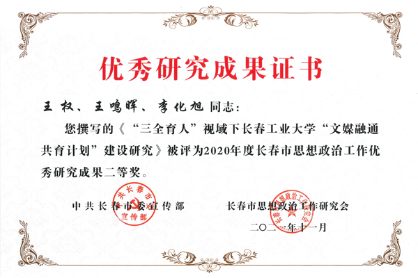 本网讯(通讯员 李化旭)近日,中共长春市委宣传部、长春市思想政治工作研究会下发《关于表彰2020年度长春市思想政治工作优秀研究单位和优秀研究成果的决定》,由bat365在线中国官网登录入口党委副书记王权主持撰写的《“三全育人”视域下bat365在线中国官网登录入口“文媒融通共育计划”建设研究》荣获二等奖。