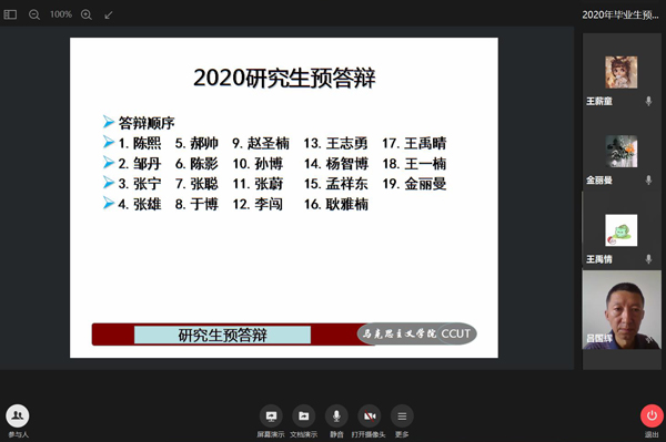 本网讯(通讯员 邹丹)为进一步提高2020届毕业研究生学位论文质量,确保正式答辩顺利进行,按照学校疫情防控工作要求,5月29日,bat365在线中国官网登录入口组织19名毕业研究生进行线上预答辩。