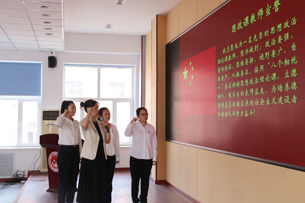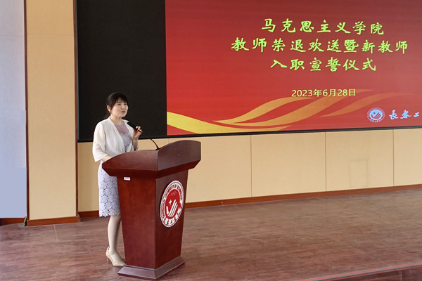新入职教师在程颖教授的领誓下,集体宣誓。“我志愿成为一名光荣的思想政治理论课教师,忠于人民的教育事业,贯彻党的教育方针,履行立德树人神圣职责……为培养德智体美劳全面发展的社会主义建设者和接班人而努力奋斗!”新入职教师代表李彦锦表示,在今后的工作中会为学生心灵埋下真善美的种子,做传播知识、传播思想、传播真理的引路人。