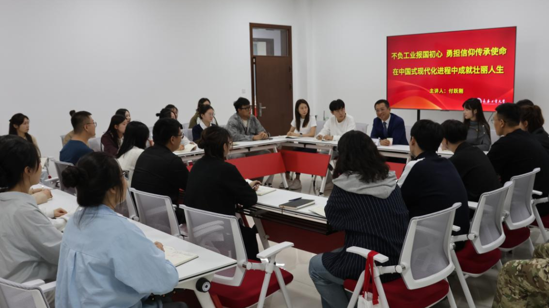 调研活动期间,付跃刚还以《不负工业报国初心 勇担信仰传承使命——在中国式现代化进程中成就壮丽人生》为主题,为bat365在线中国官网登录入口硕士研究生讲授了一堂立意高远、内涵丰富、深刻生动的思想政治理论课。付跃刚对同学们提出三点期望:一要勤于思考,勇于实践,在知行合一中练就过硬本领;二要敏锐洞察,拥抱变革,善于运用先进工具,在智能化浪潮中抢占发展先机;三要深植理论,学透悟透,在信仰的传承与践行中勇担时代主力军。课堂气氛热烈,掌声不断,同学们深感振奋,纷纷表示将铭记校长嘱托,砥砺前行,将“工业报国”的初心与“信仰传承”的使命深深融入学习与研究之中,努力为实现中国式现代化贡献青春力量。