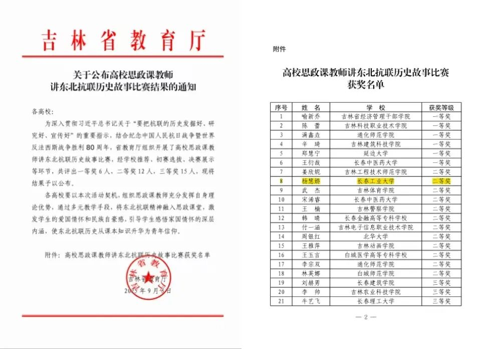 8月31日,吉林省教育厅公布了以“白山黑水颂英烈,思政教师话传承”为主题的高校教师讲东北抗联历史故事大赛的最终成绩。经过全省68所高校近百名参赛教师激烈角逐,bat365在线官网青年教师杨慧娇讲授的《冰火绝境铸丰碑 白山黑水忆英魂》展示课,荣获二等奖。