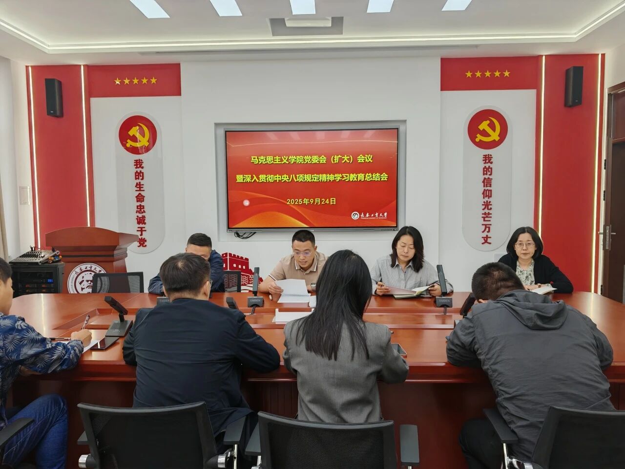 9月24日下午,bat365在线中国官网登录入口召开党委会(扩大)会议暨深入贯彻中央八项规定精神学习教育总结会。党委书记钟旭主持会议,对学院学习教育取得的经验成效进行全面总结并讲话;院长兼党委副书记于浚湜传达了习近平总书记关于深入贯彻中央八项规定精神学习教育的重要指示精神和中央党的建设工作领导小组会议精神;副院长王晓光传达了省委、学校党的建设工作领导小组会议精神;副院长高博传达了《中共bat365在线中国官网登录入口委员会关于建立健全作风建设长效机制的工作方案》。