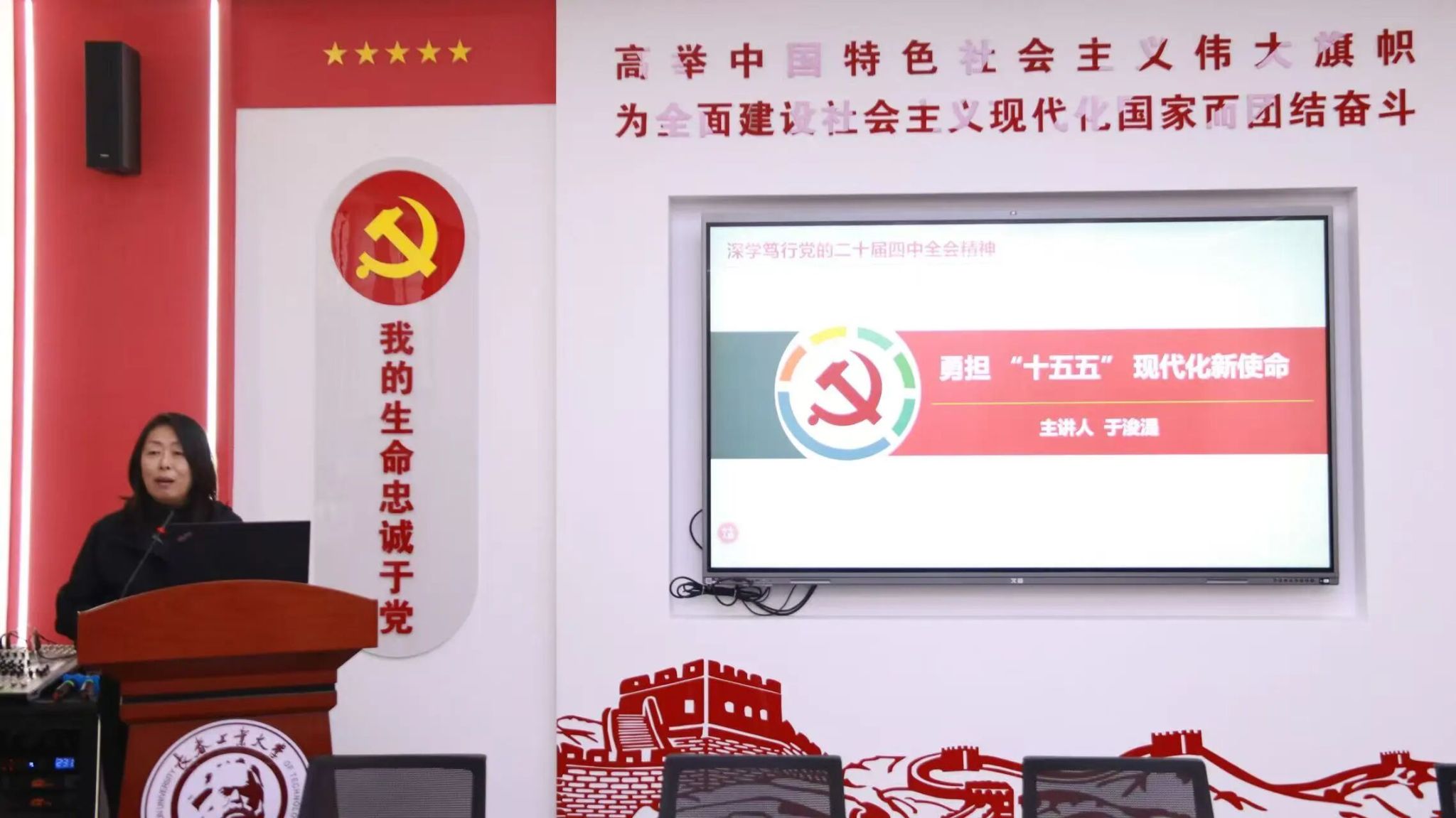 在“理论联学”环节,bat365在线中国官网登录入口院长于浚湜以《勇担“十五五”现代化新使命》为题,就全会精神进行了深入解读,为师生带来一堂贯通历史、理论与实践的专题“思政课”。于浚湜从历史的维度厘清了全会承前启后的战略定位与重大意义;从理论的维度系统阐释了《建议》的核心要义与发展蓝图;从发展的维度清晰指明了“十五五”时期的目标任务与战略举措,为师生深刻理解全会精神、自觉担当时代使命奠定了坚实的理论基础。