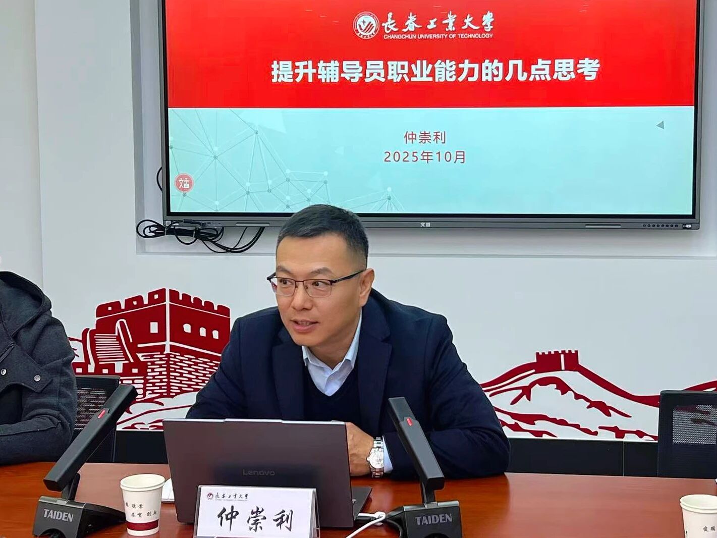 在“党课同上”环节,机关第一党支部书记、学校党政办公室主任仲崇利以《提升辅导员职业能力的几点思考》为题,为师生讲授专题党课。仲崇利立足自身丰富的党政管理和育人实践经验,从价值内涵、能力路径、情怀担当三个维度系统阐述了新时代提升辅导员职业能力的重要意义和方法体系,强调教育情怀对青年成长的深远影响,为研究生同学们拓宽职业视野、锤炼综合素养、明晰使命责任提供了扎实的理论指引与实践参考。
